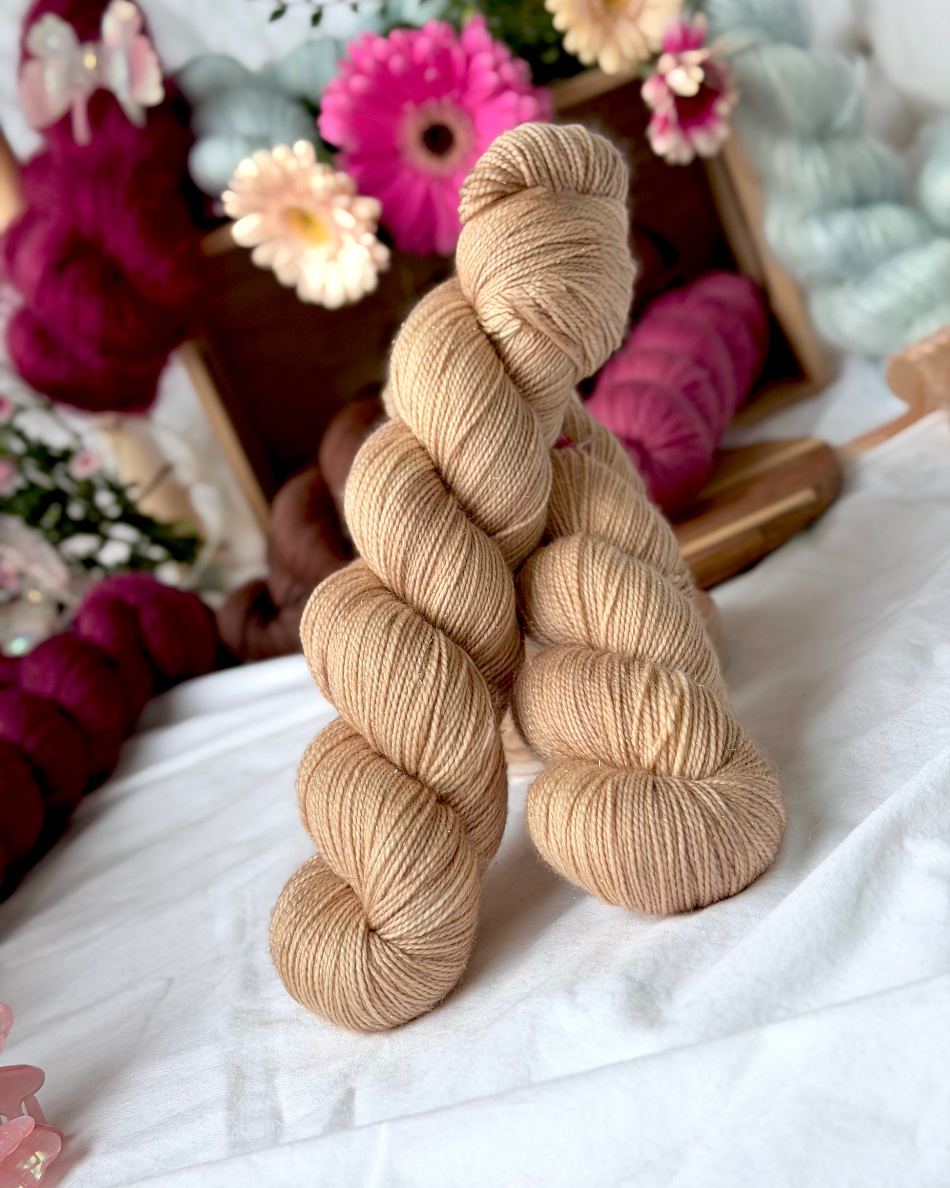 Tynn glittermerino med gold sparkle <3 Glitteret gir en superfin effekt, og garnet egner seg godt alene, i dobbel tråd eller sammen med Kid Silk Lace eller Suri Silk Følgetråd. Bejeweled er mykt nok til baby- og barnestrikk, artig i egostrikk og slitesterkt nok til sokkestrikk og vask i maskin.